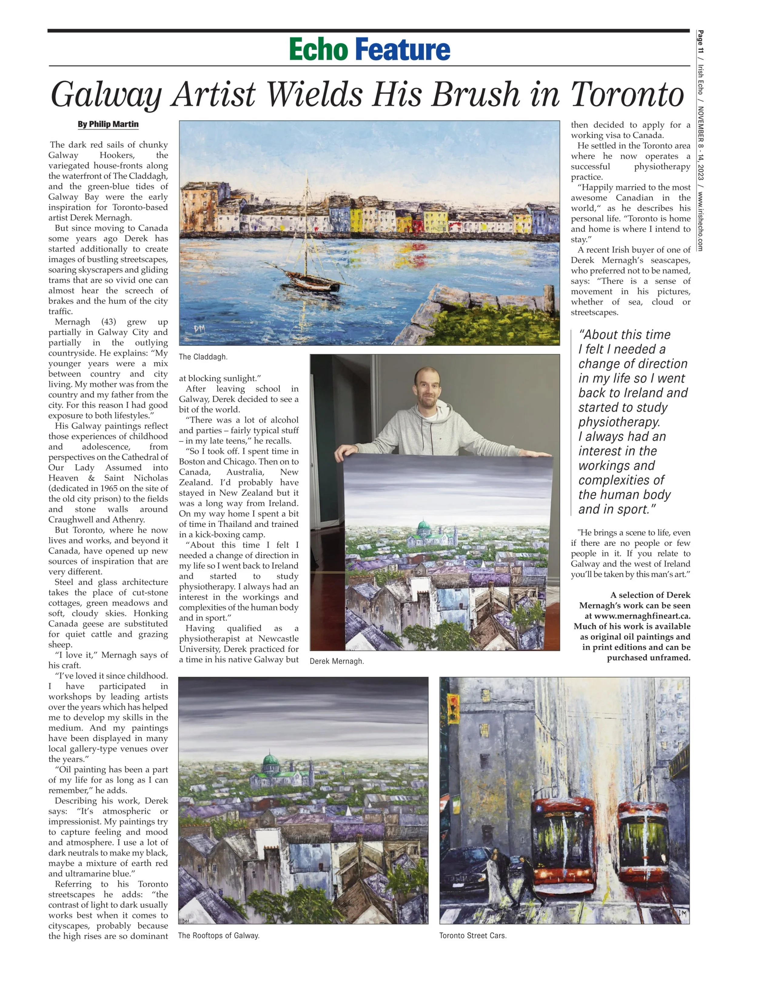 Derek was born and raised in Galway, Ireland, where the ever-changing light and rugged landscapes first inspired his love of painting. Now based in the Greater Toronto Area, Canada, he continues to draw creative influence from his surroundings, capturing both the quiet beauty of natural landscapes and the energy of urban life. Largely self-taught, Derek has been painting since childhood, developing his skills through years of dedicated practice alongside workshops with renowned artists that have helped refine his technique and artistic voice.