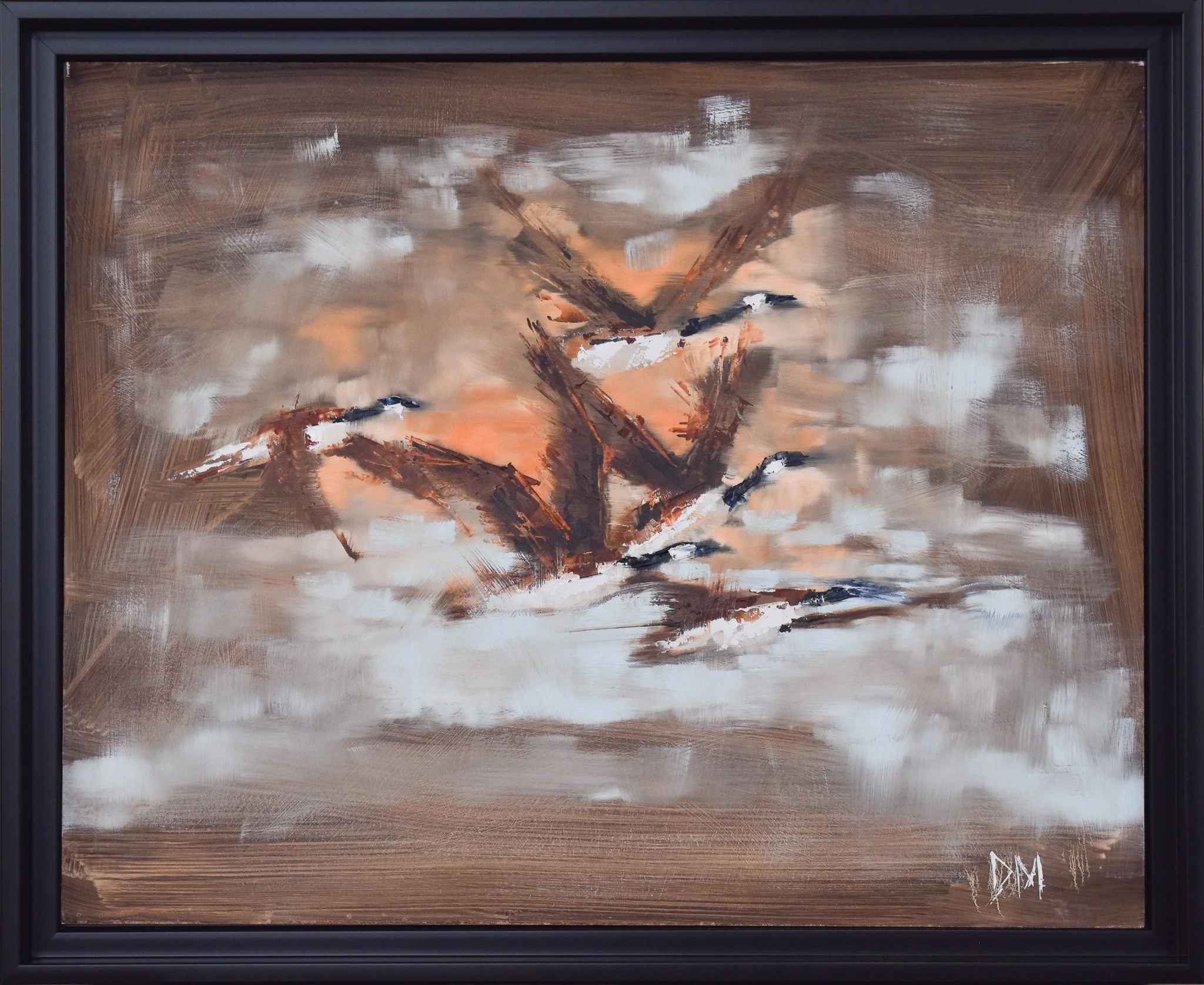 Inspired by a quiet morning observed with my wife, the piece distills the raw elegance of these creatures into a moment suspended in time. The clouds, textured behind a hammered bronze sky, frame their flight, emphasizing both their freedom and the fleeting beauty of dawn. Every brushstroke layers resilience and grace, transforming the memory of their movement into a tribute to nature’s quiet magnificence—a dance of light, life, and enduring wonder.
