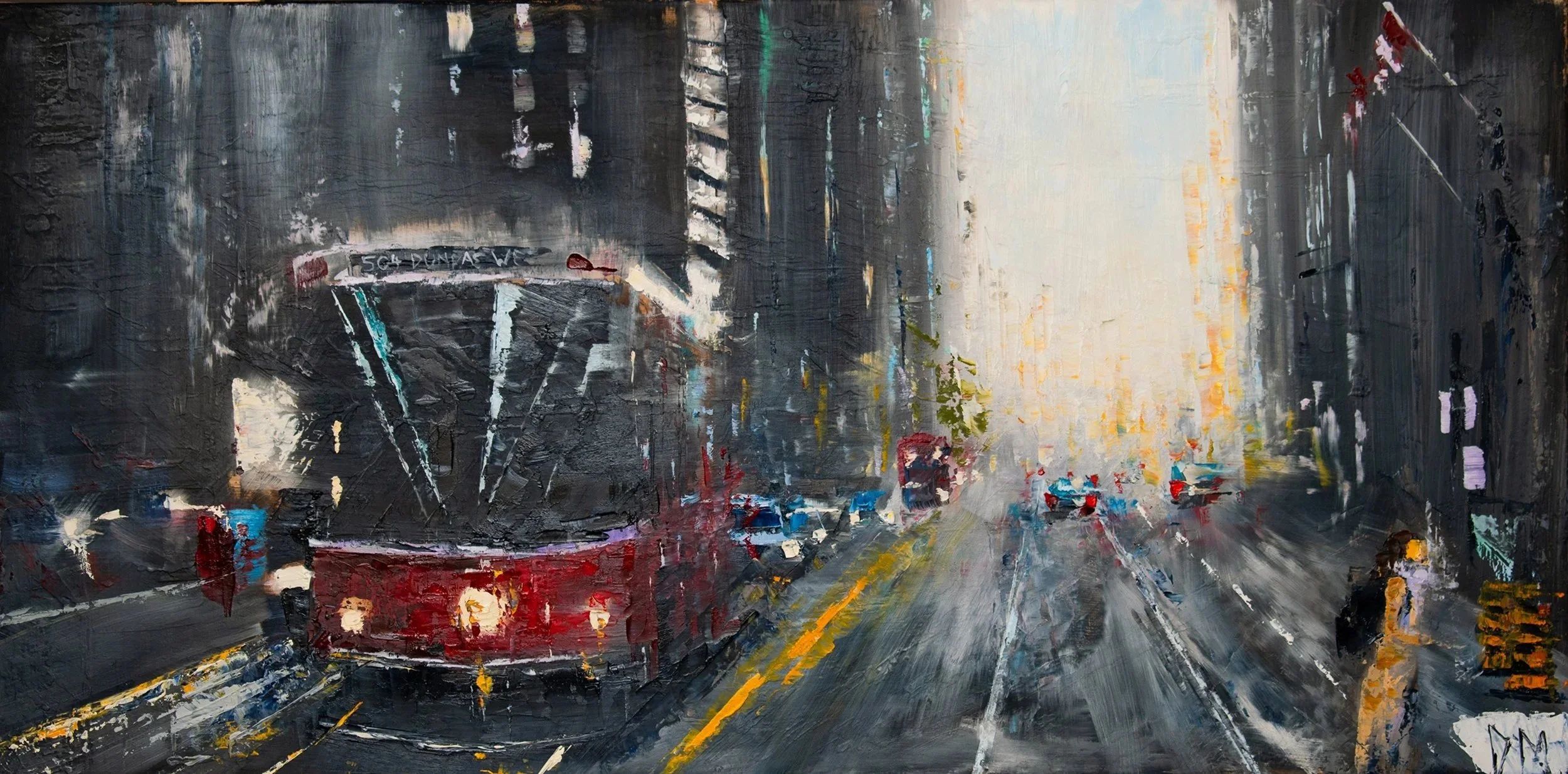 This painting captures a fleeting moment on Dundas Street West as the iconic 504 streetcar makes its steady journey through the heart of Toronto. Inspired by the rhythm of urban life and the enduring presence of the streetcar in the city’s daily narrative, I sought to portray both movement and atmosphere. Layers of oil paint were used to build depth in the reflections on the street and the worn textures of the buildings lining the route. The 504 becomes more than transit—it’s a symbol of connection, routine, and the quiet poetry found in the everyday.